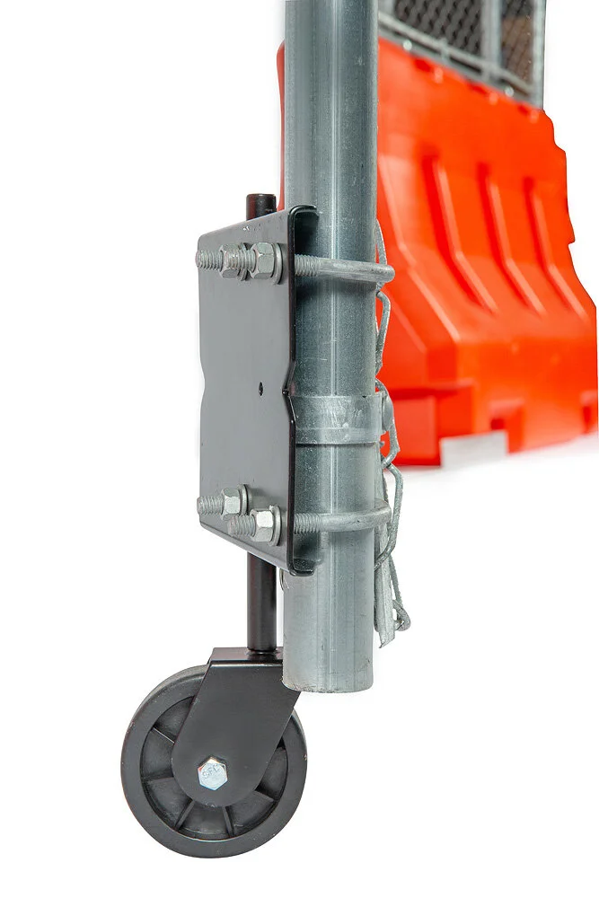 Easy to pair with any of our barricades, this accessory is a base plate that slides under the barricade, with an attached support pipe and clamp hinges to hold your gate. It can be placed so the gate can open on whichever side you choose, and will be securely held by the barricade when ballasted with water.